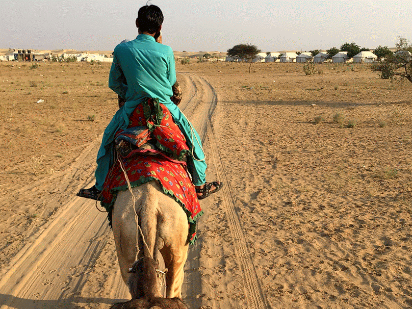 As it got dark, the various camps edging the dunes began to light up and we could tell their different themes, from the traditional music to Bollywood film scores to one particularly neon-lit blaring rap tunes. Salim looked up and grinned. “Camel race?” He clicked, and Hrithik Roshan and Carlo broke into a run.