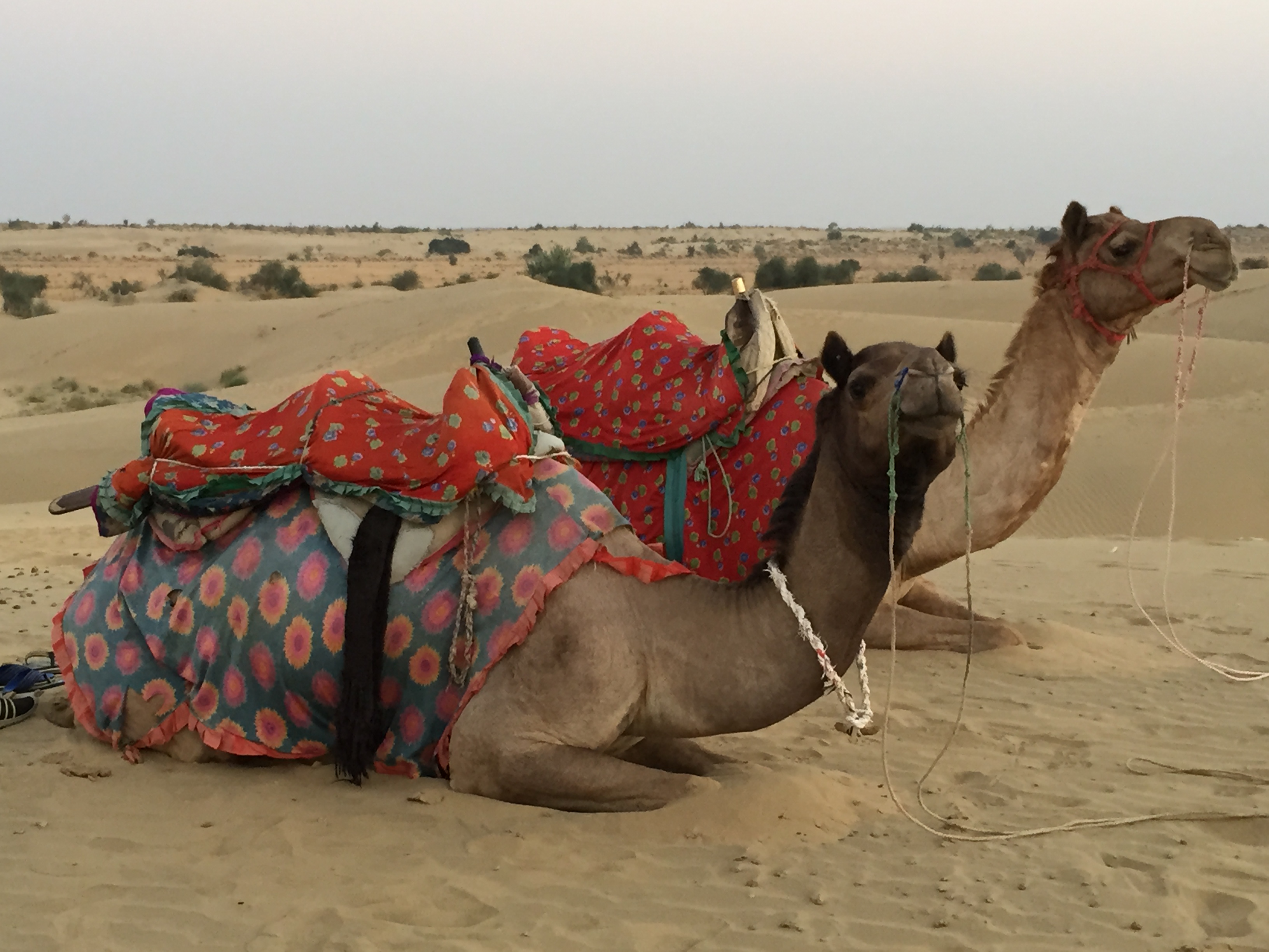With The Chairman’s blessing, we checked into our tents, and had just settled onto outside veranda chairs to drink a cup of chai tea–eat your hearts out maharajas–when we realized it was time for our pre-booked camel safari. Hurrying back to The Chairman, we started to ask about a number of items from mealtimes to the evening program of music and dance. He waved off our questions with a regal hand worthy of the Queen and murmured, “Your camels are here.”