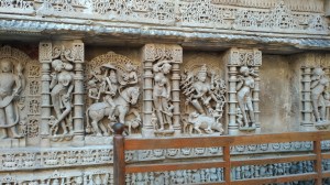 They smiled shyly and waved as we climbed past the kids perched on their stone steps. Indian monuments aren’t like those in the US. There usually aren’t guard rails, barriers, or safety equipment other than guards with whistles. In addition, Rani-Ki-Vav’s access system is unique, with the steps changing direction every few stairs, then a side few steps, and down again. It took the three of us a couple of hours to manoeuvre our way down, view all the sights, and come back up. But at some unknown signal, a hundred children flew straight down five stories to the flimsy barrier at the bottom that kept them from plunging down the remaining levels, turned without missing a beat, and less than a minute later were back at the top. Their culture-box ticked off for the day, they raced to the paths of the surrounding park, and began rolling down one of the hills. I have absolutely no doubt those (admittedly-fine) rolling slopes will be their only lasting memories of their visit.