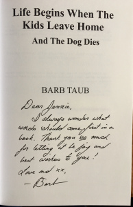Barb Taub is hilarious.  Laugh out loud, tears streaming down your face hilarious.  She is today’s version of the Erma Bombeck of the ‘60’s and 70’s (The Grass Is Always Greener Over The Septic Tank, and If Life Is A Bowl Of Cherries, What Am I Doing In The Pits to name a couple.)  That in itself speaks volumes, as every woman, mother, and housewife devoured all that Erma Bombeck wrote – and most of her books became bestsellers.