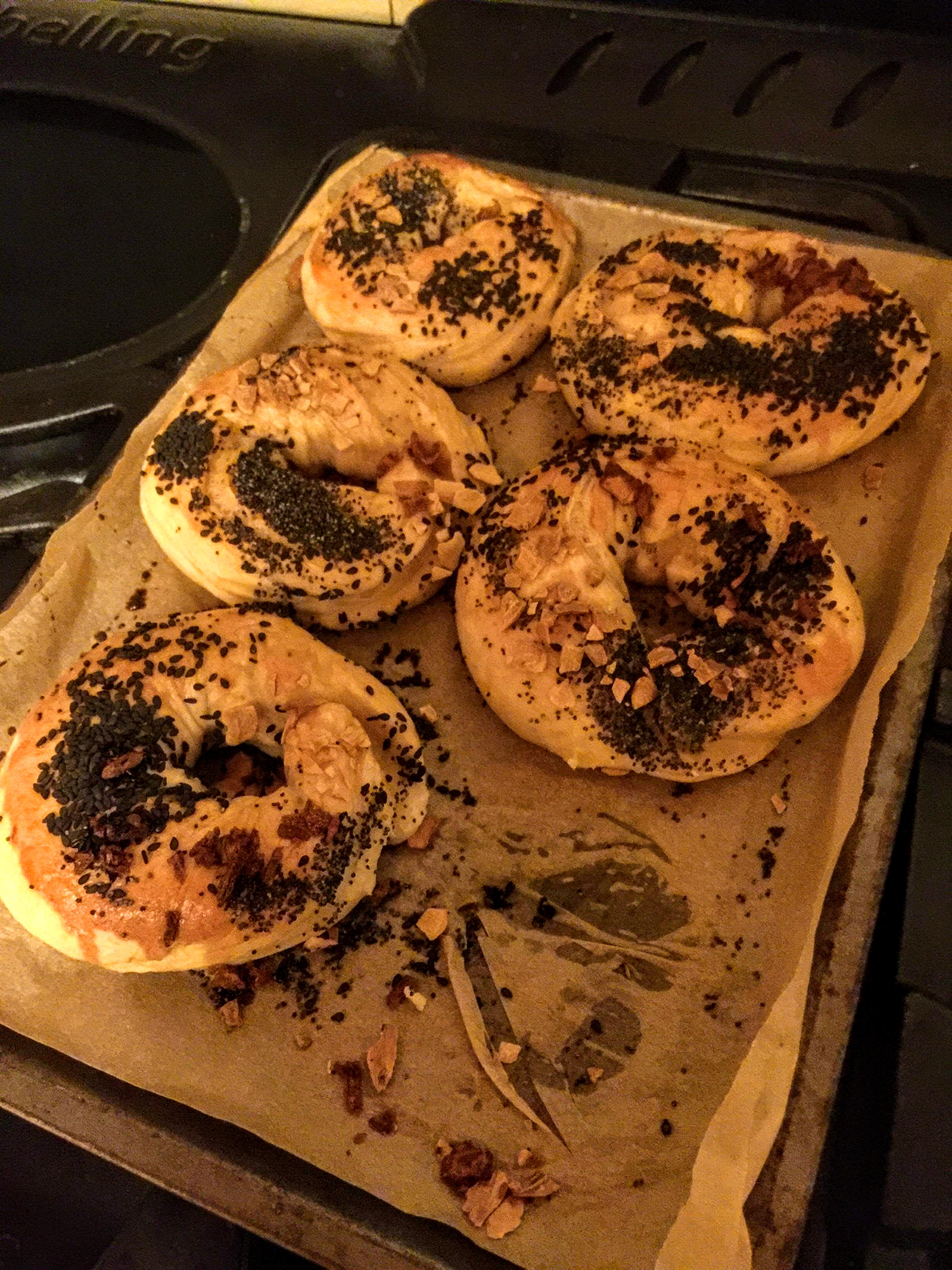 Boiled bagels were brushed with egg and honey glaze, which makes excellent glue for the toppings. (We used crispy-fried onions, toasted flaked garlic, black sesame seeds, seasalt, and of course, poppy seeds.)