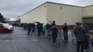 Hundreds queue just to get into the Glasgow Costco. Shoppers fight over toilet paper and hand sanitizer. [Image credit: Glasgow-live]