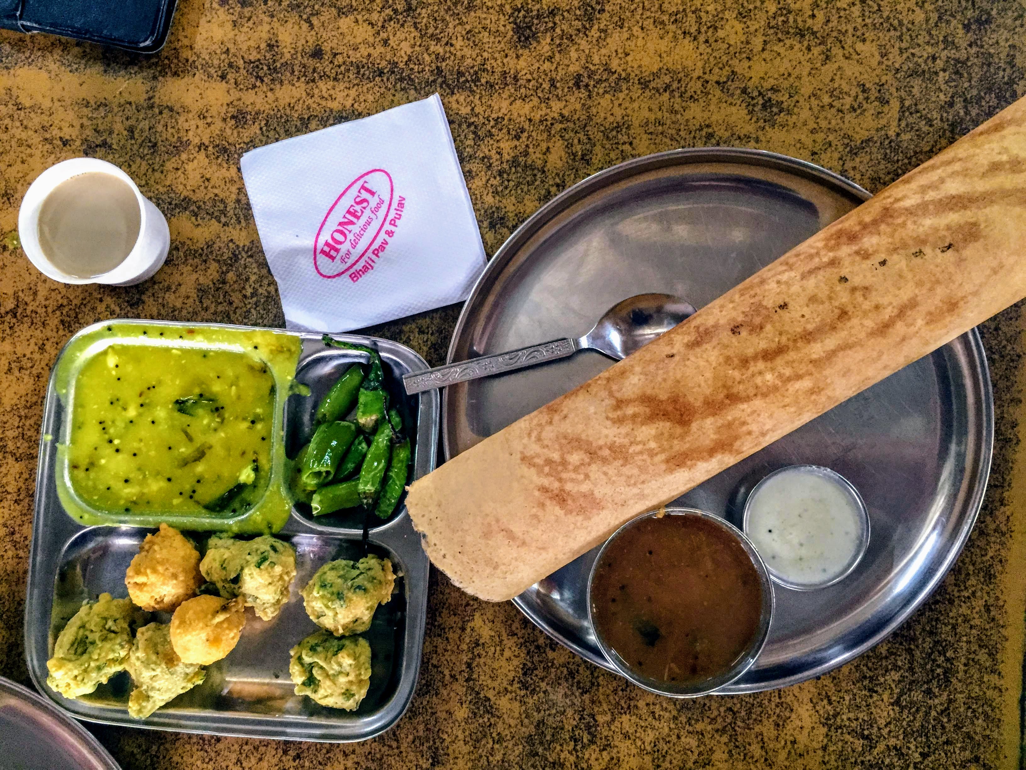 For Jaya, breakfast meant the accurately-named HONEST For Delicious Food roadside restaurant. Like most similar restaurants that don’t cater to foreign tourists, we entered through the open front and stepped into a long room full of tables and the scent of freshly fried food. The incredible smells pulled us to the rear, where signs indicated meals were “self service” and instructed diners, “Please don’t ask for extra glasses.” In a bright open kitchen, we watched our order being prepared by cooks working at top speed to turn out mountains of methi gotas—small fried balls called bhajiya, filled with fenugreek leaves, cilantro, and spices. They came with an assortment of chutneys, plus melt-in-your-mouth dosa pancakes the length of your arm, and chai tea.