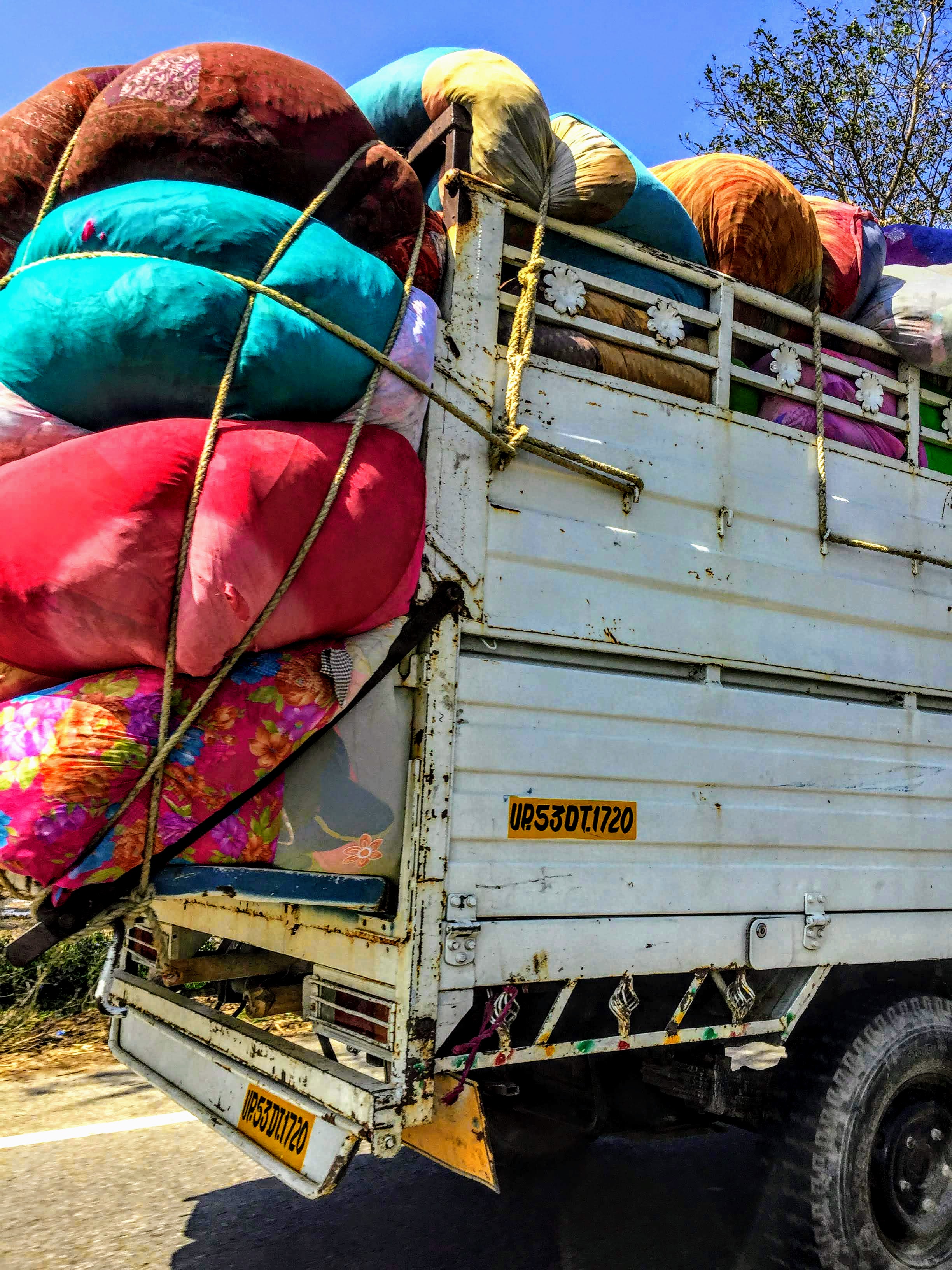 Trucks passed us, swaying with overload cargoes of everything from grasses to snack packages to gigantic bags stacked to impossible heights, often with passengers clinging casually to the sides and tops. Dashrath mentioned the bags contained pressed cow dung, but assured us that they “hardly ever” came loose and crashed into the cars behind them. Janine and I mouthed in unison, “Hardly ever?