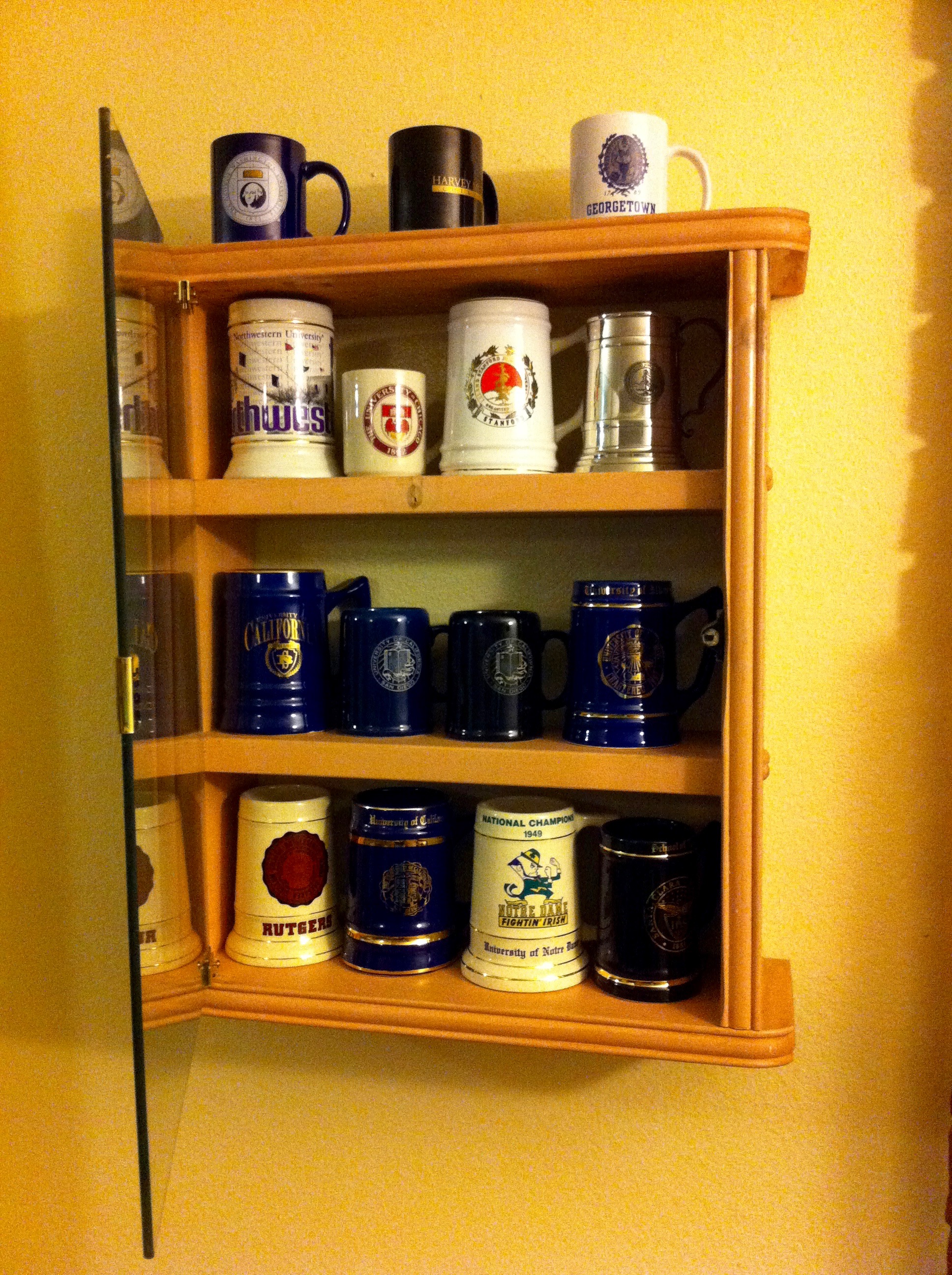 People used to ask how he got all ten kids to go to college. The answer was simple: we all thought our only choices were go to college or go to Notre Dame. Some people have deer heads or fish as trophies, but my father’s proudest trophies from his victories over forty-plus years of tuition payments were displayed in his case containing mugs from each of our colleges.mug-trophies1 (1)