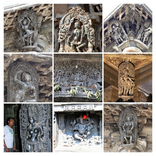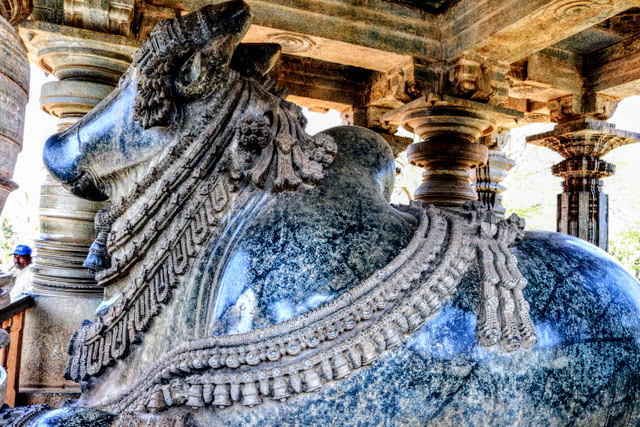 After a traditional tali lunch eaten off banana leaf ‘plates’, we were ready to face the next temple, this time sans guide. The Hoysaleswara Temple in Halebid is actually two temples honoring Shiva. Each has a pavillion facing the entrance which contains twin statues of Nandi (the bull companion of the god Shiva). The monolithic sculptures watch with timeless serenity over the stunning remains of the twelfth-century Halebidu temple complex that was still not completed when sacked by fourteenth-century invaders who smashed the faces on the hundreds of carvings.