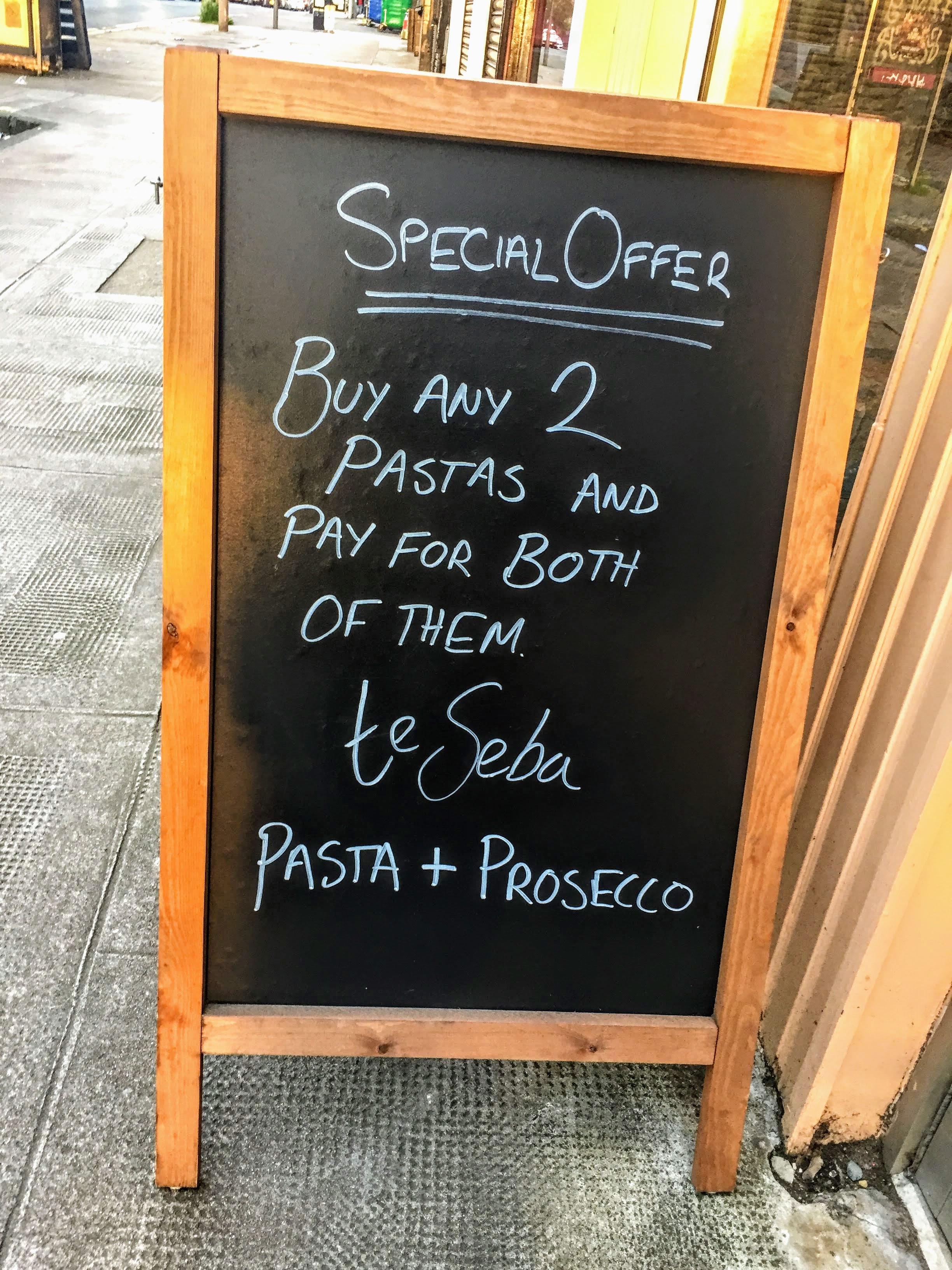 What a deal! We’ll have the special, please. [te Seba Pasta & Prosecco, Great Western Road, Glasgow]