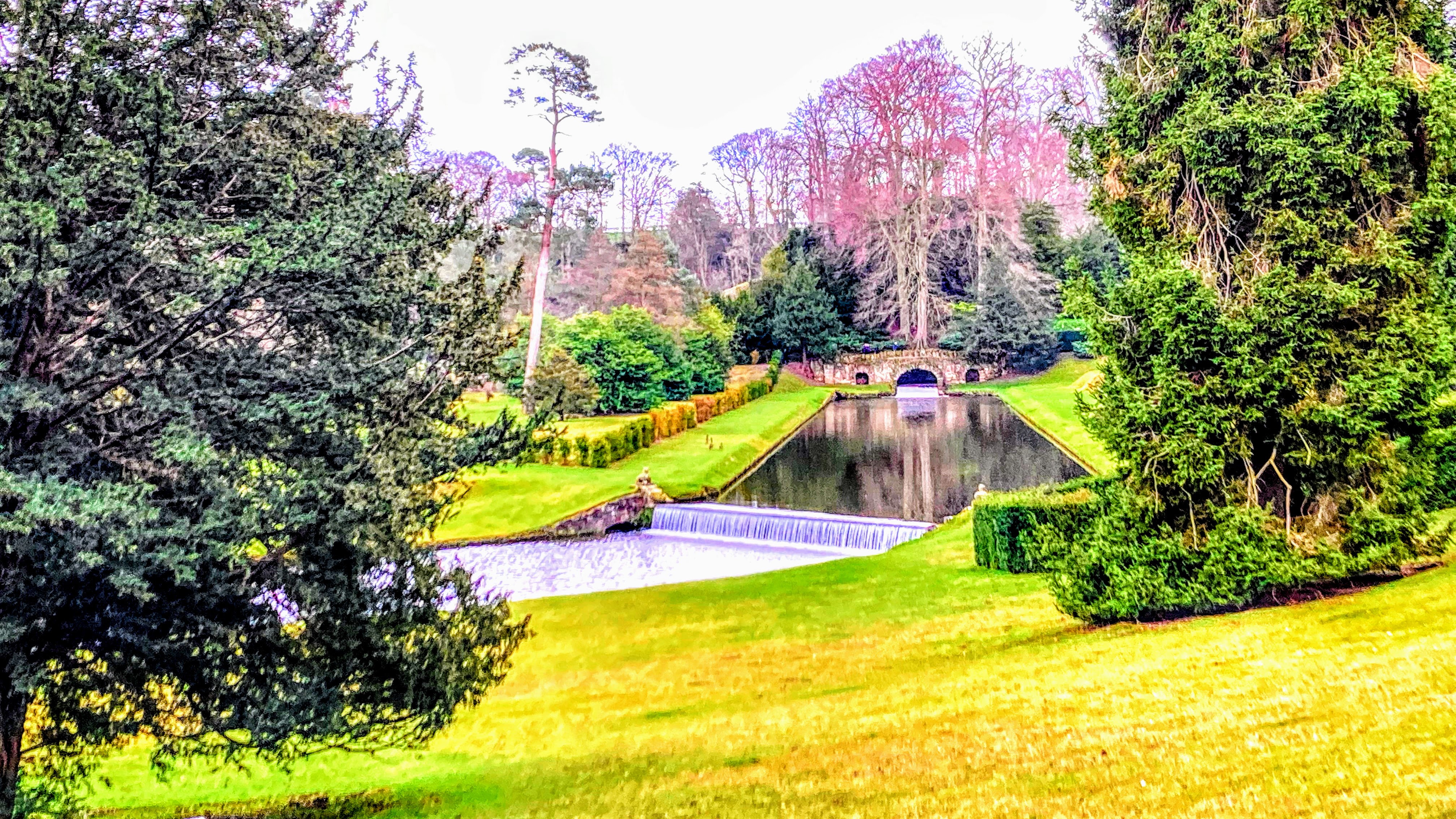 The water feature was miles of lake, shaped to gently highlight temples, classical statues, waterfalls, and gardens.