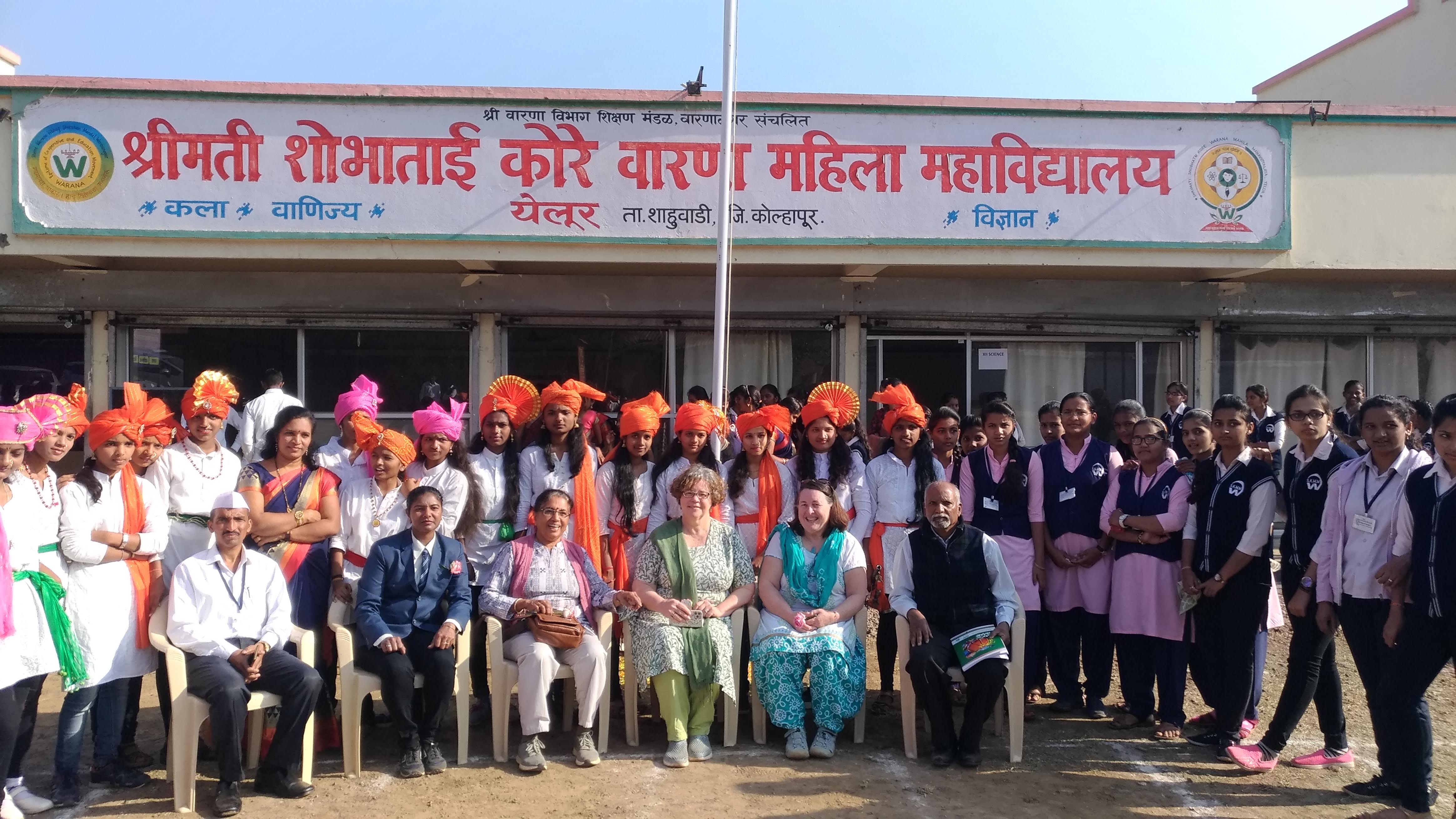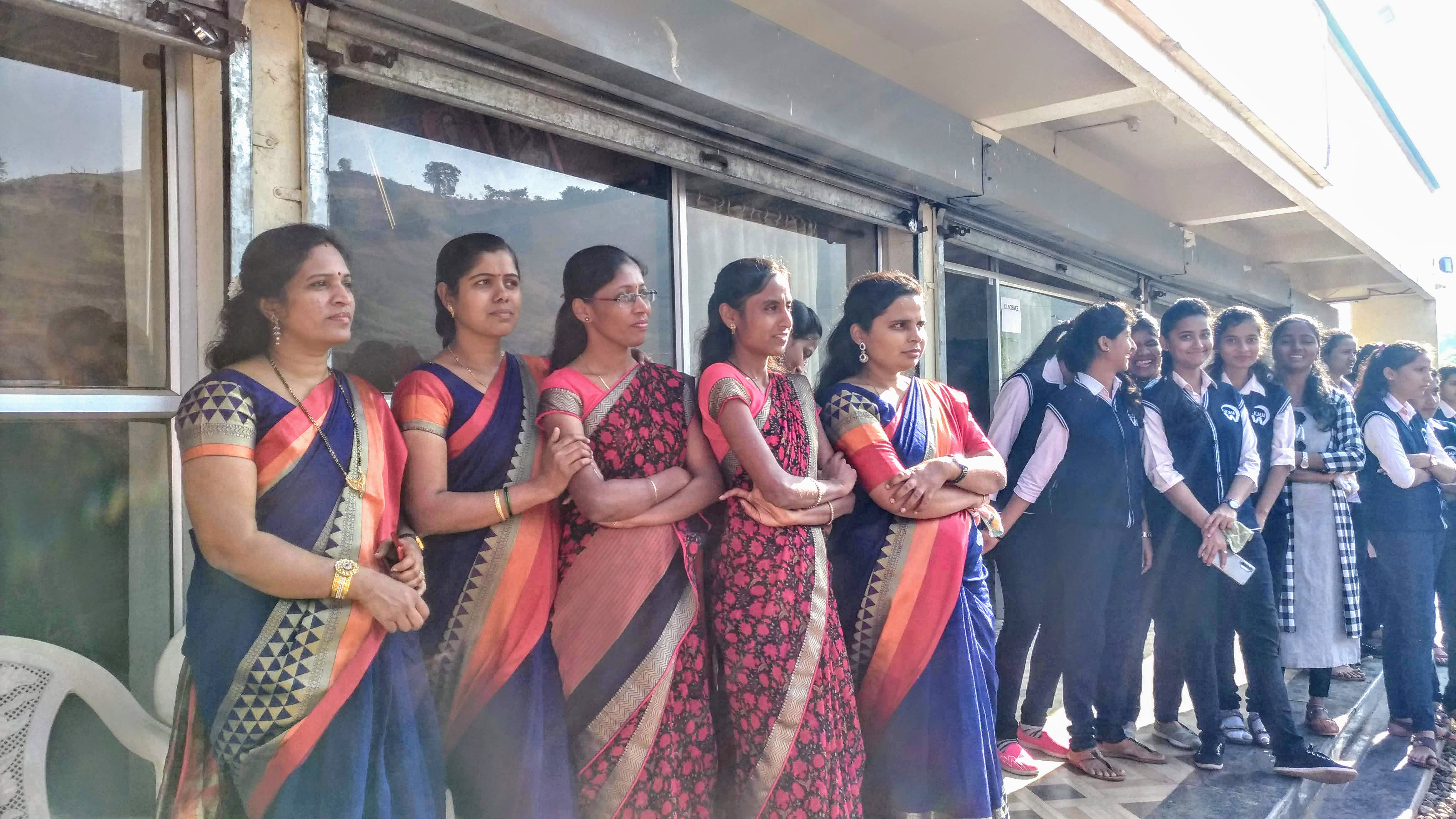 I had to pull on shoes, so Janine and Jaya had moved toward the crowd by the time I followed. Only…something was happening. The neat lines of children were now a surging mass. They swept me up and pushed me toward the front, where school staff were already warmly welcoming Janine and Jaya, and exclaiming over my arrival. Foreigners! Right here at our school, Smt Shobhatai Kore Warna Mahila Mahavidyalaya, in Yelur!