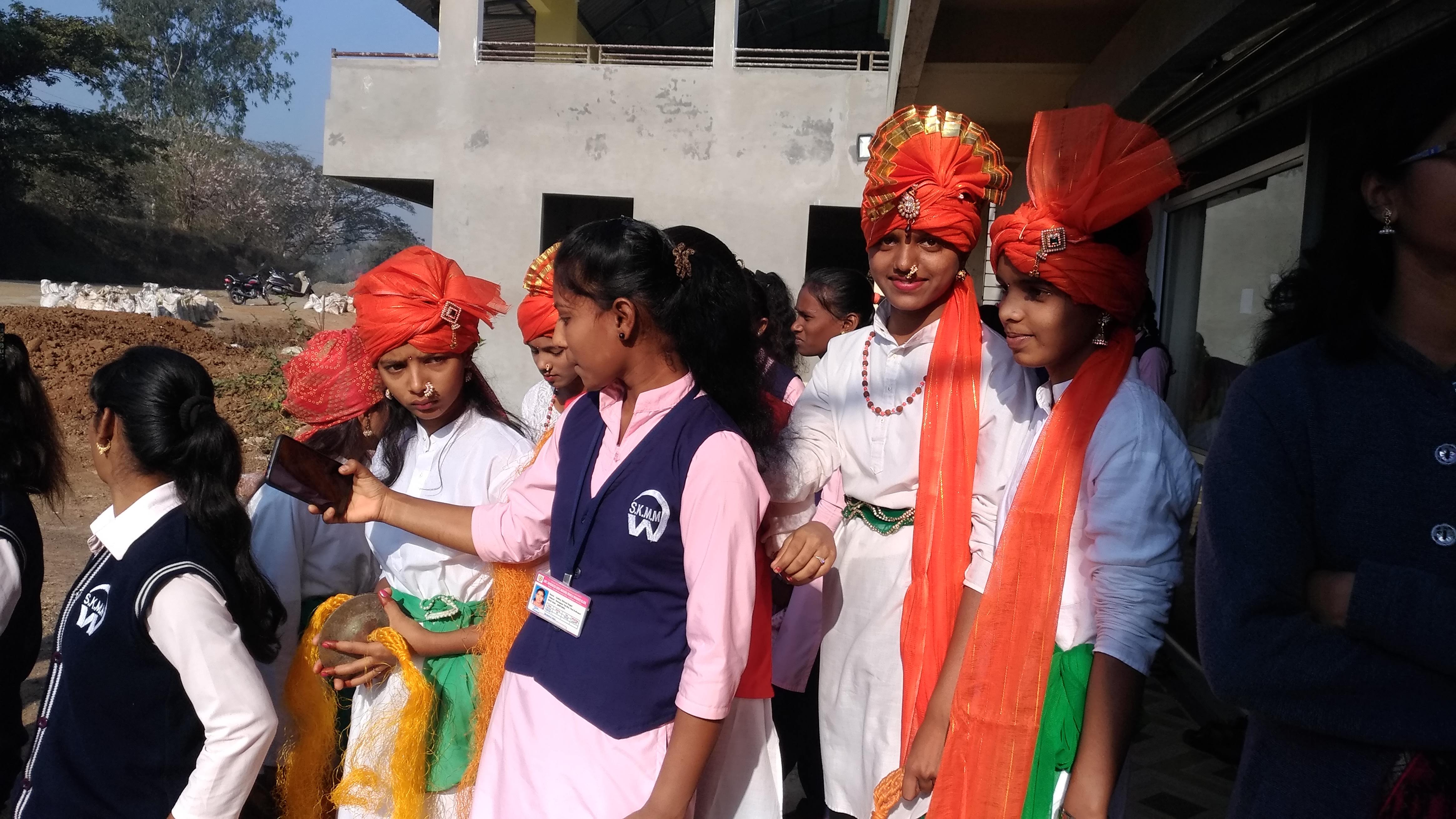 It wasn’t until we’d almost passed through the town of Jadhavwadi that we saw one of the celebrations just starting. Children were lined up along either side of a large playing field, some in uniforms and others wearing colorful hats and costumes. Our long-suffering driver, who has now had several weeks to get used to us, was already pulling over and turning around as we shrieked our need to see more.