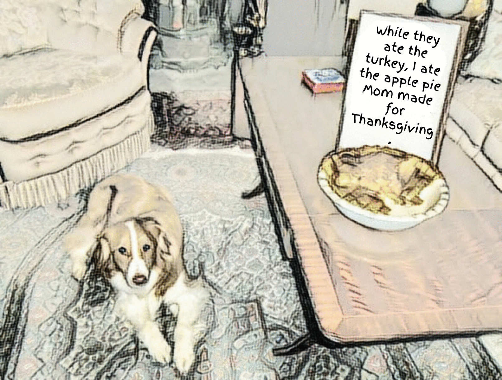And if Rockwell had hung around past the initial turkey shredding, he could have seen the Grey Lady backing me into the room where the pies were cooling. Very quickly after, he could have painted a delighted therapist dog sitting next to what was left of the giant deep-dish apple pies meant for dessert. I was so thankful for the gift from the pie-angels as I ate the center of each one. Barb was thankful for wonderful family and friends who insisted the chocolate ice-cream dug out of the bottom of the freezer was the perfect end to such a traditional American Thanksgiving.