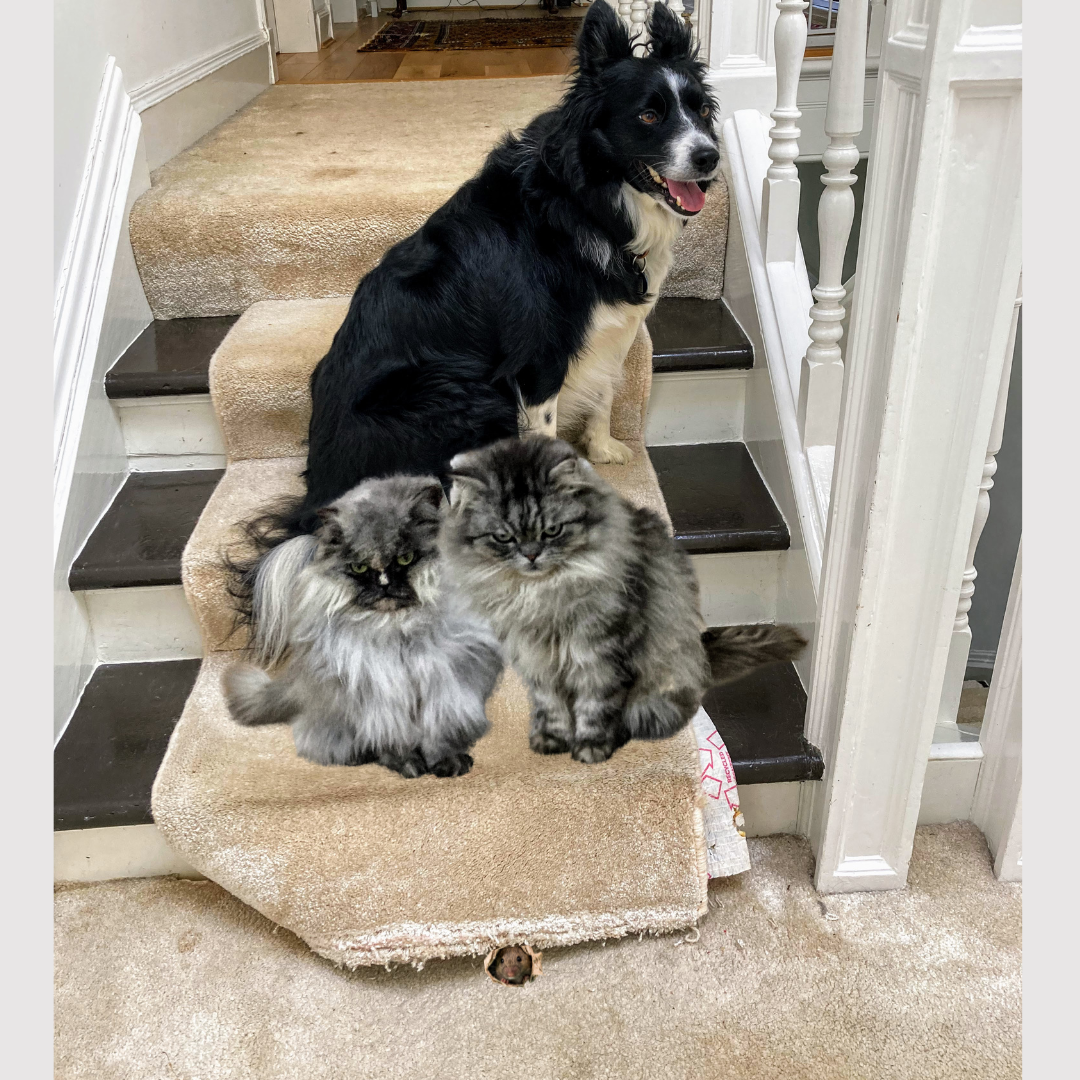 When the ripping was accompanied by two cats howling the song of their people because they couldn’t reach their new toy, I knew it was time to act. Going into the hallway, I saw the cats had completely torn out the bottom step’s carpeting (which had been both nailed and glued into place). Peeping from under the folds was the mouse they had been trying to reach, while the dog barked at all of us.