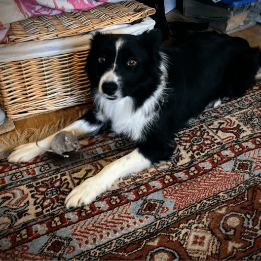 Overcome with excitement at the prospect of something she could actually herd, the dog snatched up the mouse and raced back to my room. There she deposited the mouse between her front paws and attempted her border collie stare which had been known to force entire flocks of sheep (and the Hub) to do her bidding. The two gazed at each other before the unimpressed mouse ran under the spare bed.