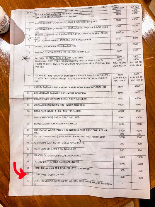 The hotel receptionist gave us a taxi menu, so we began planning our next day. First we had to choose a set package, one which would not involve #26, a ₹300 extra charge “If the guest vomit or wet.”