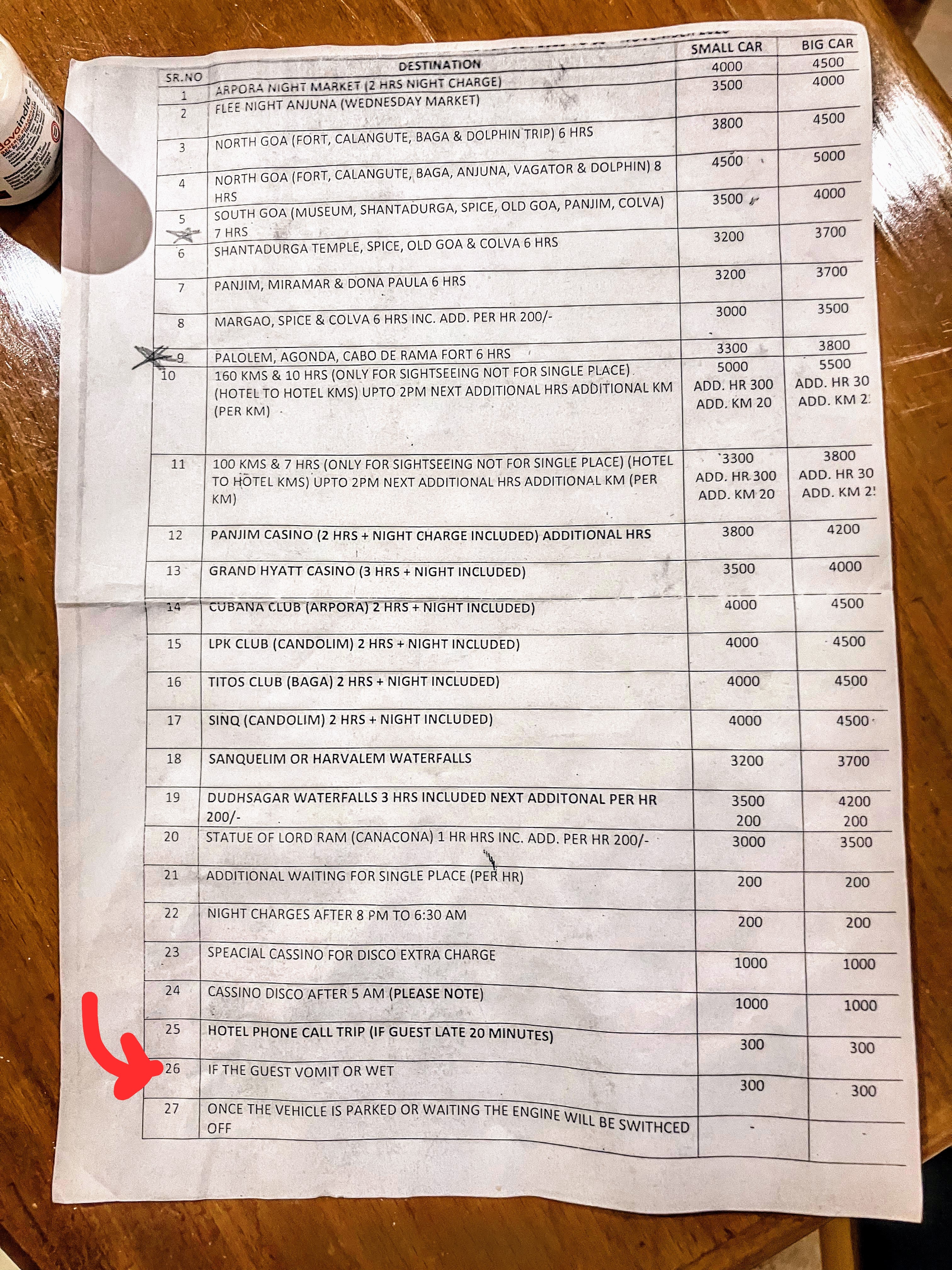 The hotel receptionist gave us a taxi menu, so we began planning our next day. First we had to choose a set package, one which would not involve #26, a ₹300 extra charge “If the guest vomit or wet.”